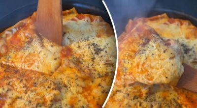 Næste skridt er at hælde tomatjuice over massen og lægge lasagnepladerne på panden, så de “drukner” lidt i væsken. Efter et par minutter drysser du den dovne lasagne med ost og lader den stå under låg på bålet, indtil alle ingredienserne er gennemkogte.